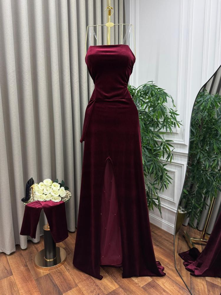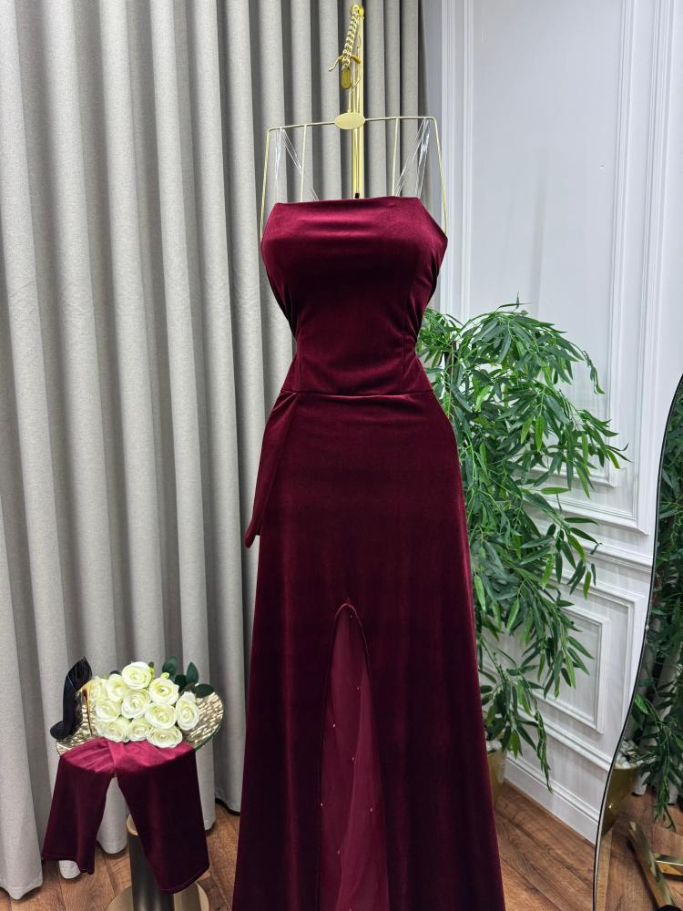- تصميم عصري يتماشى مع صيحات الموضة في فساتين سهرة مخمل طويل
