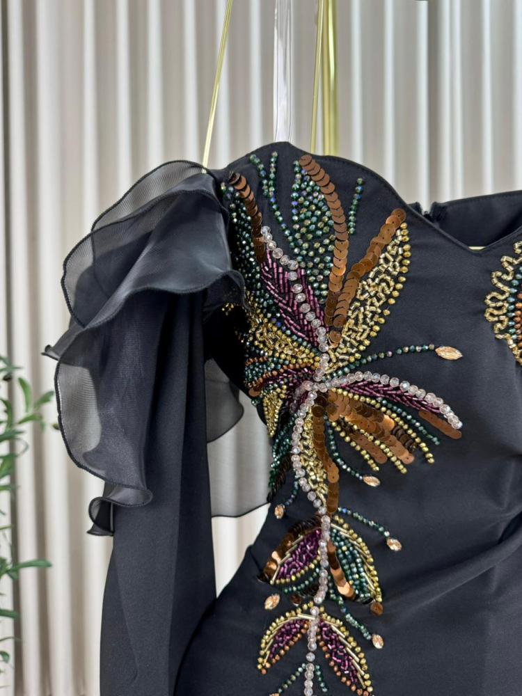 - تطريز يدوي أصلي يضيف لمسة جمالية فريدة ويبرز تفاصيل الفستان بدقة عالية