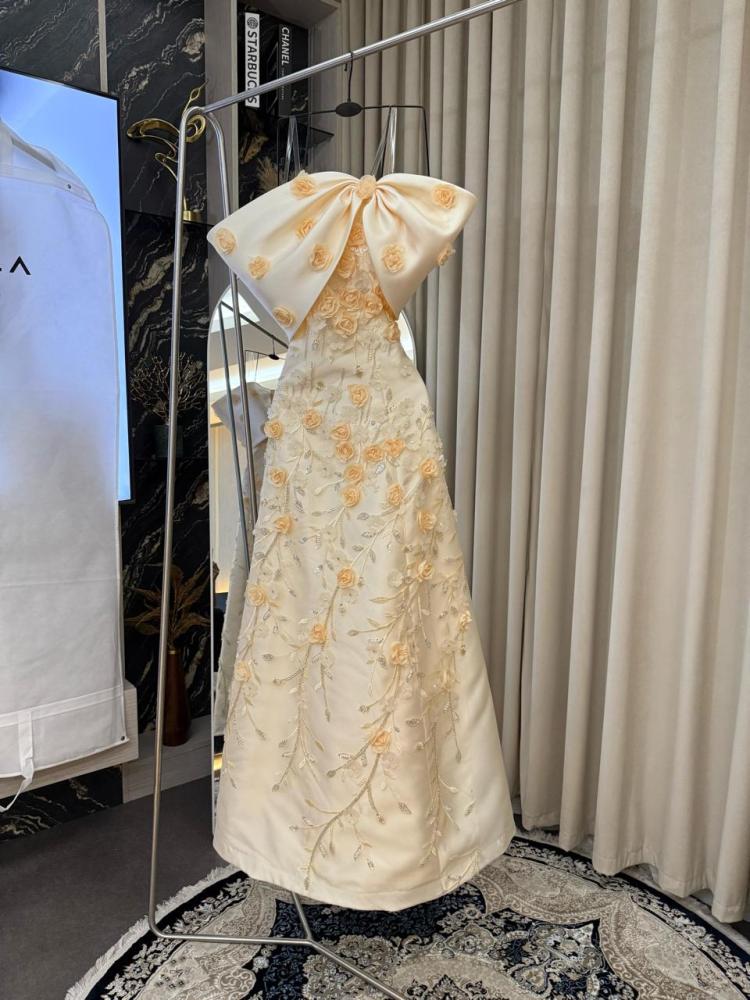 • التطريز الورد البارز يضيف بعداً جمالياً مميزاً للفستان