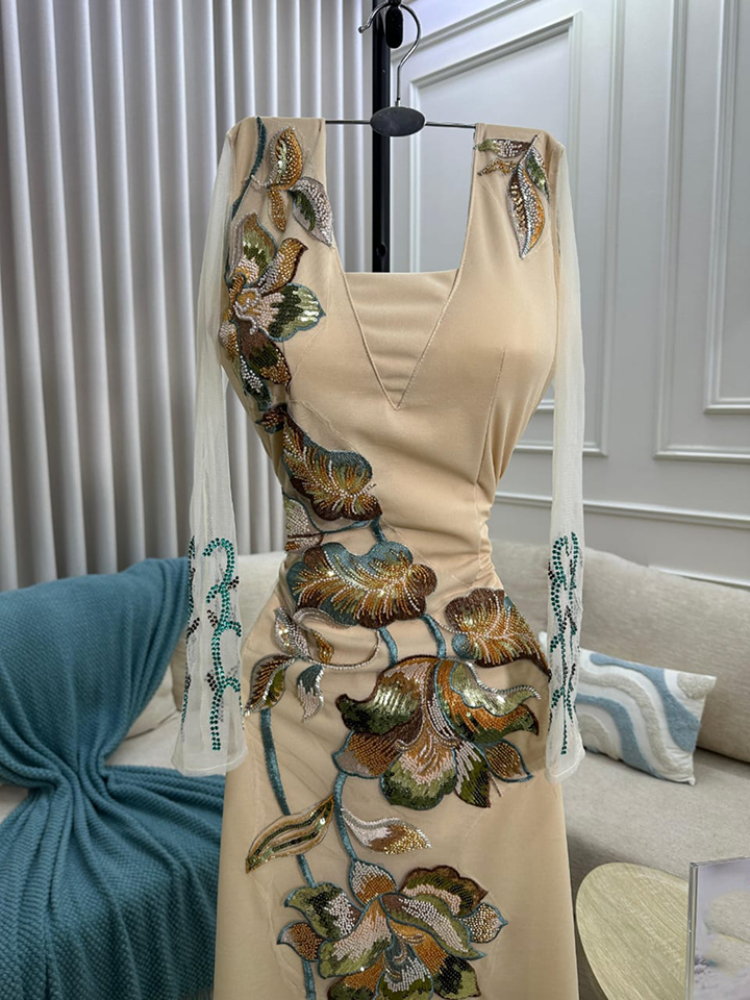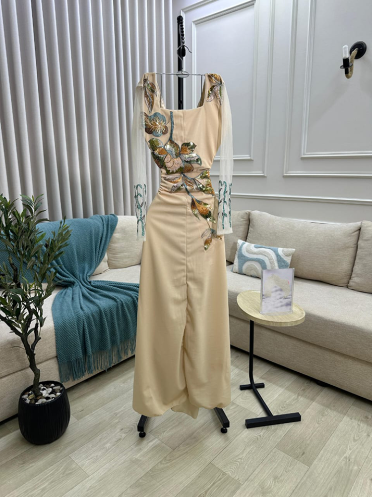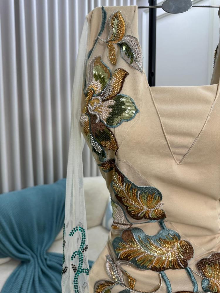 - كلفة تطريز فاخرة تضيف بريقاً أنثوياً جذاباً يناسب أجواء السهرات