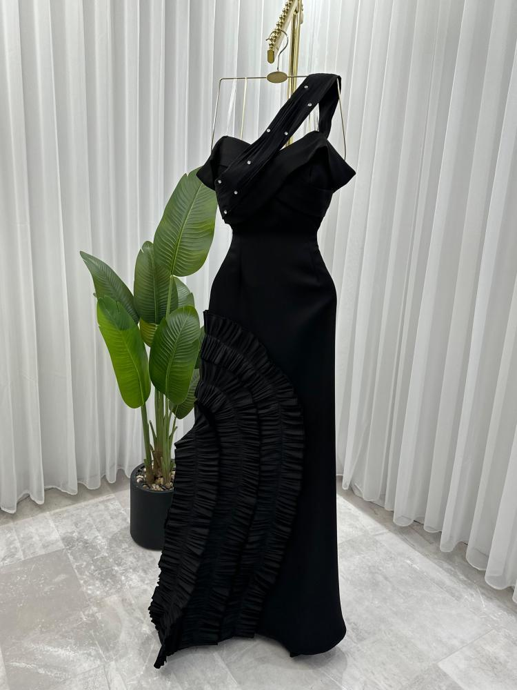 يتميز فستان كريب أسود بتفاصيل تجعله قطعة فريدة في خزانتك: